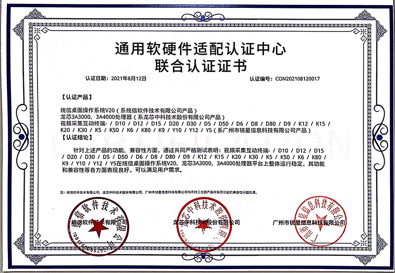 龍芯認證證書(無線視頻展臺、視頻采集終端)