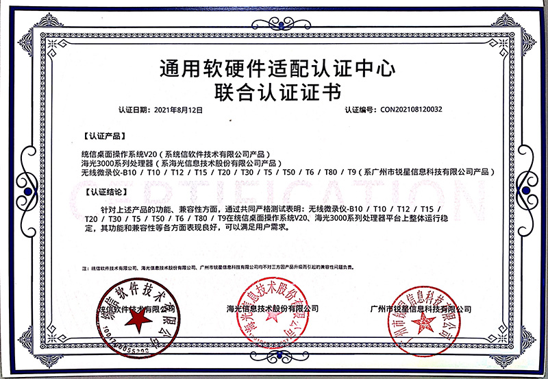 海光認證證書(展示互動寶、無線微錄儀)