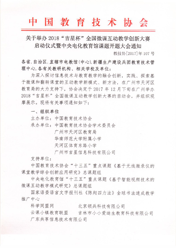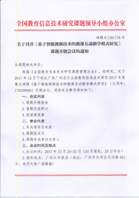 為推進(jìn)重點(diǎn)課題研究工作的深入開展并深化課堂教學(xué)應(yīng)用,12月25日,中央電化教育館、中國(guó)教育技術(shù)協(xié)會(huì)兩家重磅教育機(jī)構(gòu)同期舉辦的年度盛宴——由華南師范大學(xué)信息技術(shù)學(xué)院教授焦建利教授領(lǐng)銜的【中央電化教育館“十三五”重點(diǎn)課題《基于智能視頻技術(shù)的微課互動(dòng)教學(xué)模式研究》開題研討會(huì)】、中國(guó)教育技術(shù)協(xié)會(huì)主辦的【2018“吉星杯”全國(guó)微課互動(dòng)教學(xué)創(chuàng)新大賽啟動(dòng)儀式】暨廣州市天河區(qū)教育局主導(dǎo)的【“互聯(lián)網(wǎng)+教育”全國(guó)教師協(xié)同發(fā)展研討會(huì)】,將在廣州華南師范大學(xué)附屬小學(xué)和廣州市天河區(qū)體育東路小學(xué)隆重舉行!